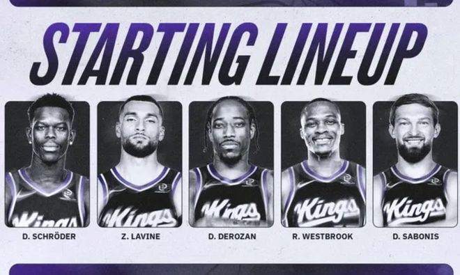 而对于国王队来讲,球队还是打得太过于挣扎,目前战绩仅为1胜2负,排名西部第11位,确实让人失望。本场比赛,首发阵容方面,国王队这边,欧文继续因伤缺阵,教练排出的首发五人组为:威斯布鲁克、拉文、德罗赞、施罗德、萨博尼斯;雷霆队这边,杰威缺战,首发阵容则为:谢伊-吉尔杰斯-亚历山大、吕冈茨-多尔特、卡森-华莱士、阿隆-威金斯、以赛亚-哈尔滕市泰因。